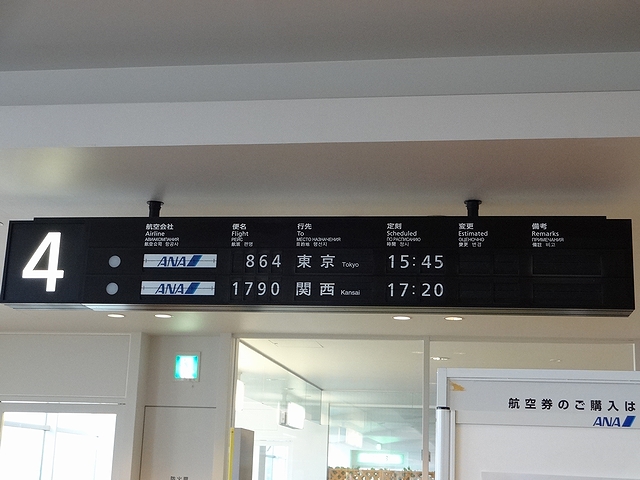 いつもの搭乗口前の出発案内板です。搭乗機のANA121便はボーイング767-300です。那覇まで2時間35分もかかるんですね。